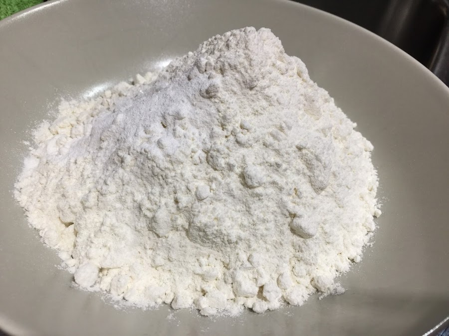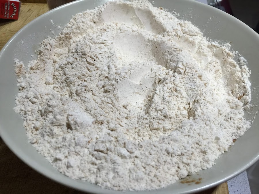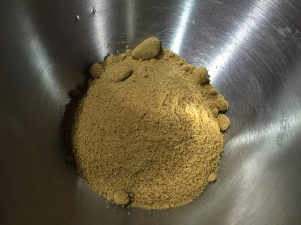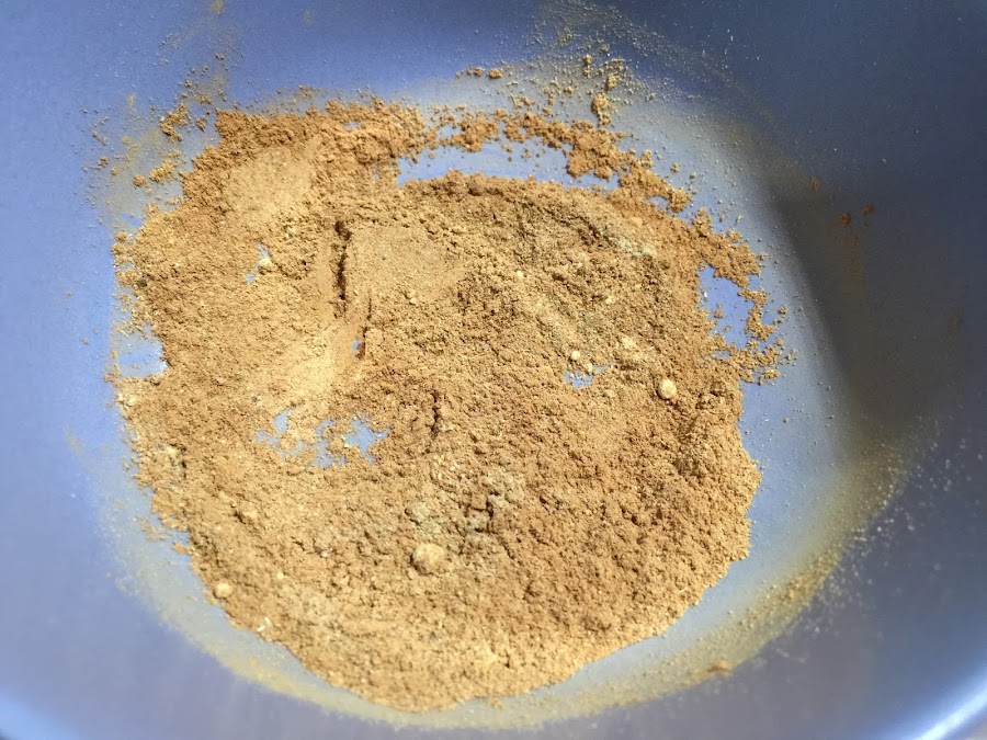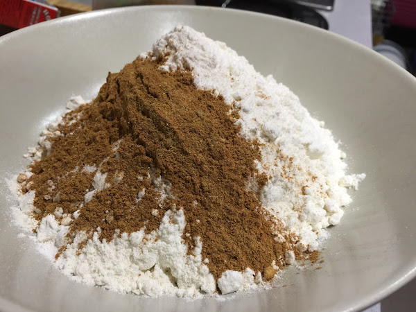 2. En otro recipiente mezclamos la harina junto con la levadura y la pizca de sal. Le añadimos la mezcla de especies y removemos bien todos los sólidos.