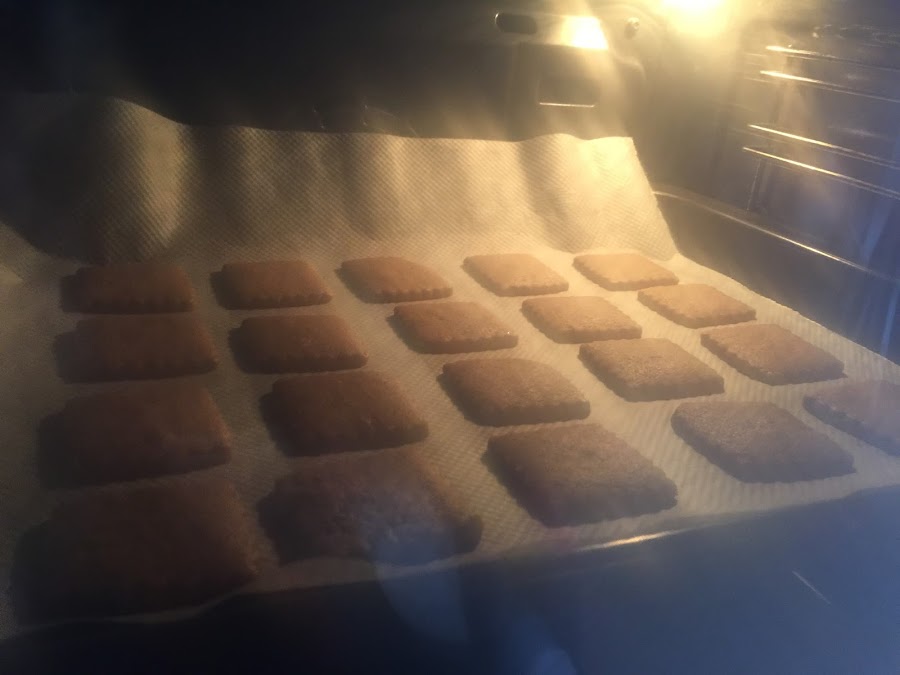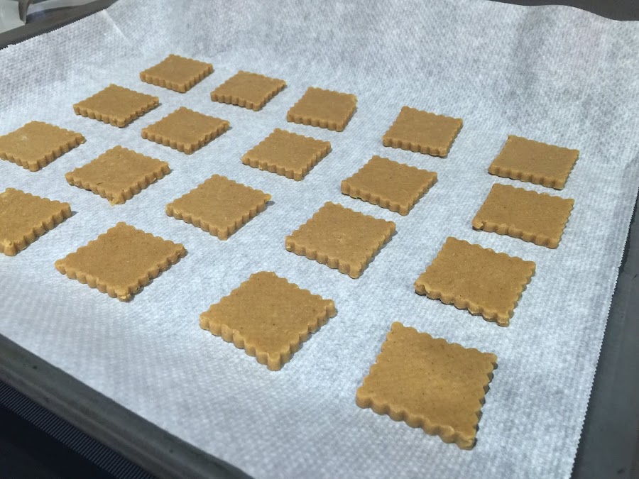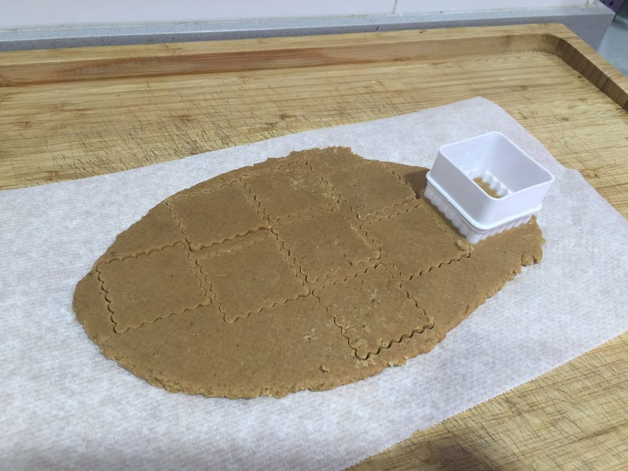 8. Llevar a la nevera las tres placas, dejar enfriar mínimo dos horas. Yo siempre las dejo de un día para otro, así garantizamos que estén completamente duras.9. Con un cortapastas de forma cuadrada cortamos las galletas y las pasamos a una bandeja de horno cubierta con papel vegetal. Los restos de masa que nos queden después de cortar las galletas, los juntamos de nuevo, alisamos y volvemos a cortar con el cortapastas. Entre las galletas dejar un espacio de unos 2cm por cada lado, al hornearlas aumentan ligeramente el tamaño.