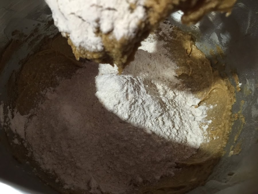 5. Finalmente añadimos a la masa todos los sólidos que habíamos mezclado al principio. Mezclamos lo justo para que se integren todos los ingredientes, no más.