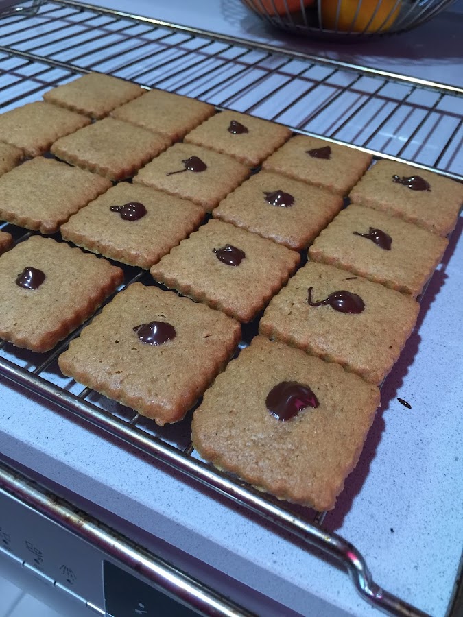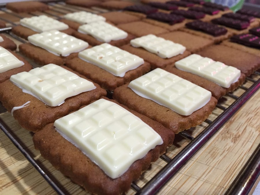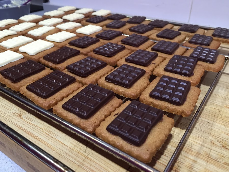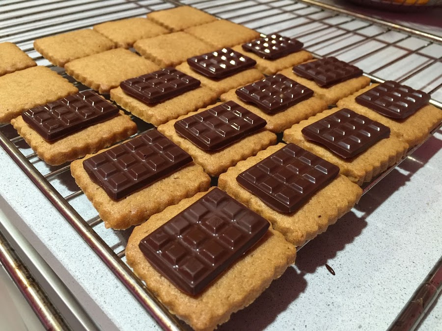 11. Para decorarlas he decidido poner una mini tableta de chocolate encima de cada galleta. Para hacerlo debemos esperar a que las galletas estén totalmente frías.