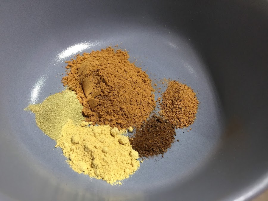 1. En un recipiente mezclamos todas las especies; la canela, cardamomo, jengibre, clavo y nuez moscada.