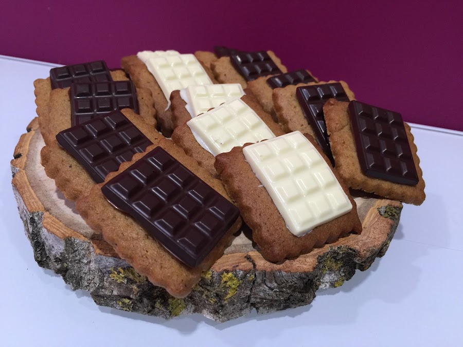 Fundimos el chocolate y rellenamos el molde de las chocolatinas. Para que endurezca más rápido lo ponemos 3-4 minutos en el congelador. Ponemos una gotita de chocolate fundido sobre la galleta y a continuación ya podemos poner nuestra mini chocolatina encima de la speculoos.
