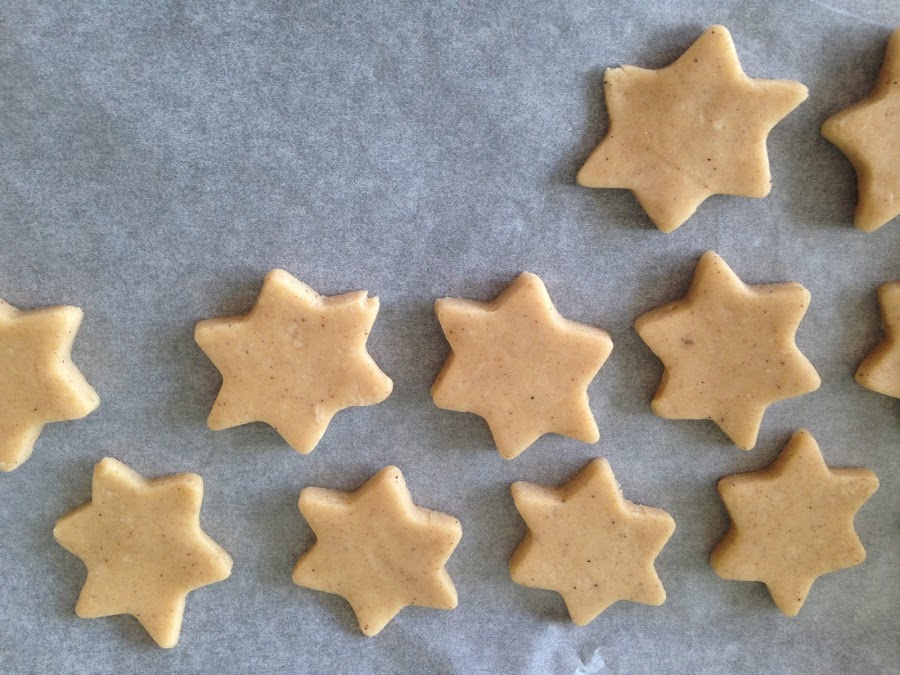 Una vez reposada la masa la ponemos entre dos papeles de horno y la estiramos con un rodillo hasta que quede de 1 cm de grosor, las cortamos con el cortador que más nos guste o simplemente con la boca de un vaso pequeño y horneamos a 175 grados, calor arriba y abajo y opción ventilador si tenéis unos 7-8 minutos o hasta que estén ligeramente doradas.
