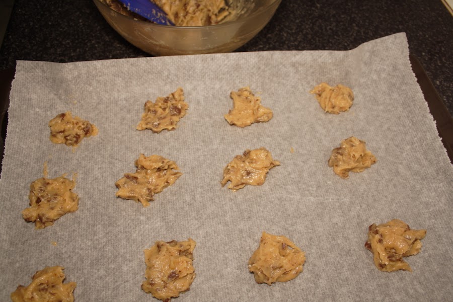 Forramos con papel de hornear una bandeja de horno y con la ayuda de una cuchara vamos poniendo pequeñas porciones de nuestra masa, que queden separadas, porque en el horno la masa aumenta de tamaño. A mi me salieron dos bandejas de galletas.