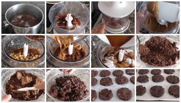 Trituramos los dátiles en un robot de cocina o procesador de alimentos con un poco del agua anterior. Picamos bien hasta conseguir una pasta, si fuera necesario añadirle un poco más de agua. Tiene que resultar una pasta pegajosa no muy densa. Reservamos.