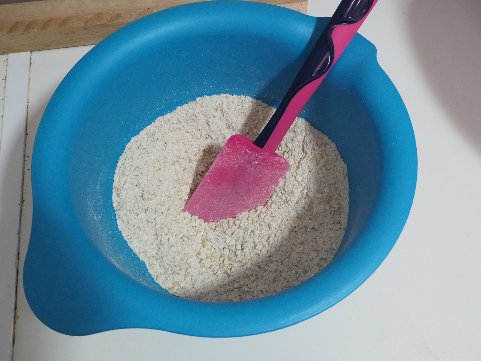 - Mezclamos los ingredientes secos en un bol: harina, copos, salvado, levadura y sal.