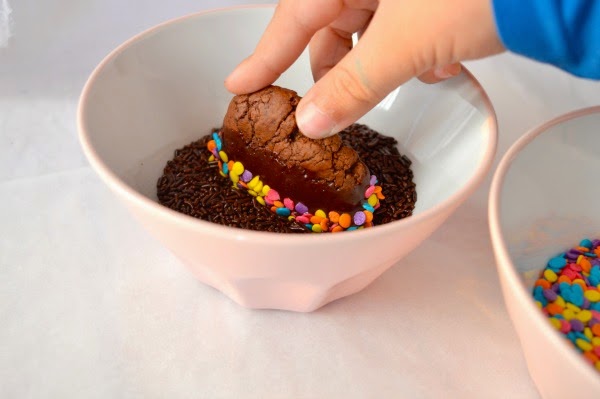 Prepare three little bowls. One for the chocolate glaze, one for the sprinkles and one for the chocolate vermicelli.