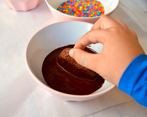 Pues como os decía, no fue un reto fácil. Primero, porque a mis niños, que son comodones, les gusta más que mami las haga y comérselas, que hacerlas ellos. Aunque he de decir, que esta vez se han portado y me han ayudado. Bueno, en verdad, el mayor ha hecho la mitad de las galletas, las ha hecho bolitas, las ha aplastado... y luego junto con el pequeño, las han terminado de decorar con el chocolate y los sprinkles. Les ha gustado mucho, pero que sepáis, que preferían comérselas en el momento y ni siquiera esperar a que se enfriaran ni a que el chocolate se solidificara en el frigorífico. He de reconocer que yo también. No podíamos esperar a que se enfriaran para probarlas.