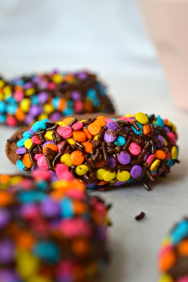 Firstly, dip the cookie in the sprinkles, shake off the excess of them, and later, dip the cookie in the chocolate vermicelli and shake off the excess of them, again.