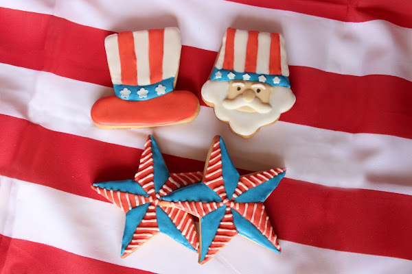 Galleticé la cara de Tío Sam (el molde era un cortador de galletas en forma de cupcake al revés) y el típico sombrero del 4 de julio, para esta galleta no utilicé ningún cortador, sino que hice un plantilla en forma de sombrero.