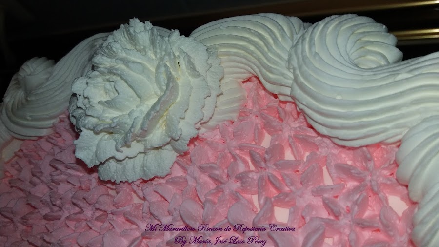 Y unas bonitas ondas de nata montada (crema de leche), coronadas con una bella flor. Elegí los colores blanco y rosa porque resultan delicados y hacen un buen contraste.