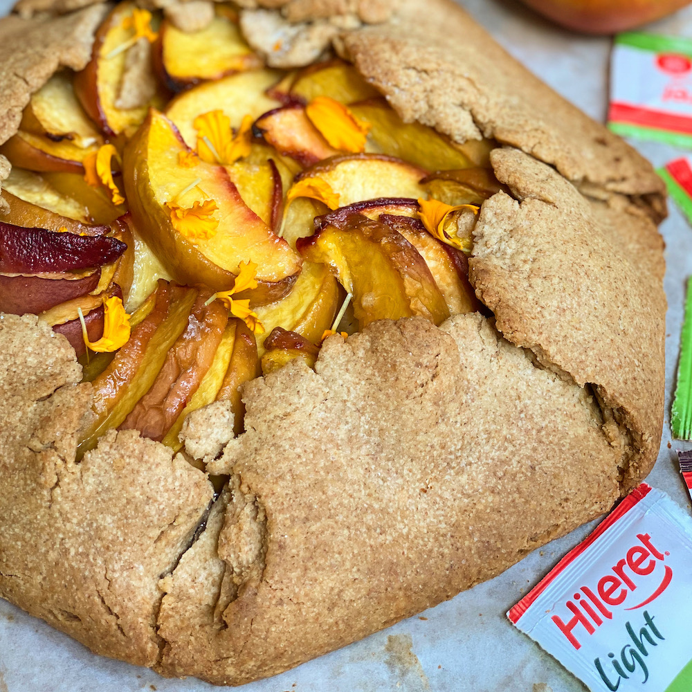 Poner la manteca pomada en un bowl y mezclar con el azúcar Hileret Light y la esencia de vainilla.Añadir las yemas de huevo de a una y mezclar.Añadir el harina integral y unir sin amasar.Envolver en papel film y reposar 15 minutos en la heladera.Extender la masa entre 2 papel manteca e ir girando para el mismo lado, de esta manera quedará formado un circulo parejo.Colocar la masa en una plata para horno Retirar el papel manteca .Colocar sobre la masa los duraznos sin carozos cortados en gajos.Espolvorear la cucharada de azúcar Hileret Light y distribuir la manteca cortada en cuadraditos.Colocar los bordes de masa hacia adentro..Cocinar en horno a 170ºC durante 50 minutos.Dejar enfriar.Listo! A disfrutar!