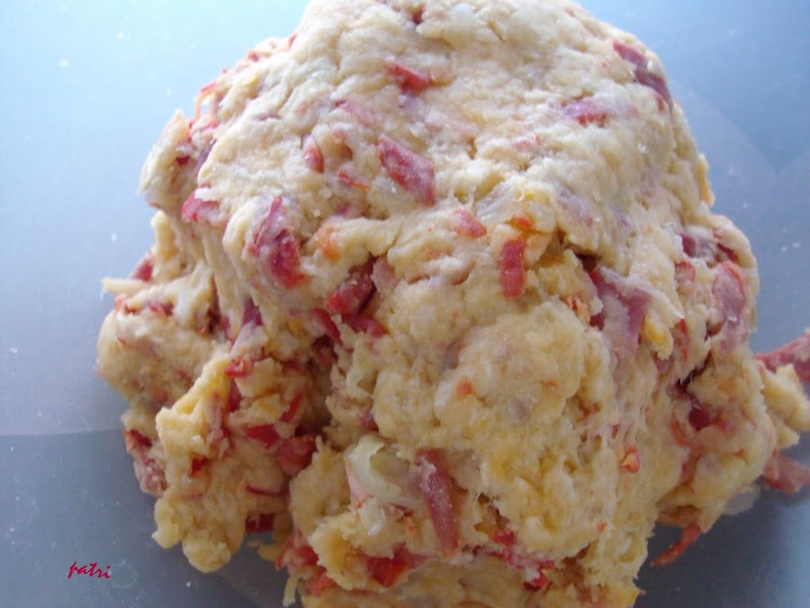 añadir el chorizo.. la cebolla. y el queso ..y amasar .. e ir añadiendo el agua..poco a poco conforme haga falta..