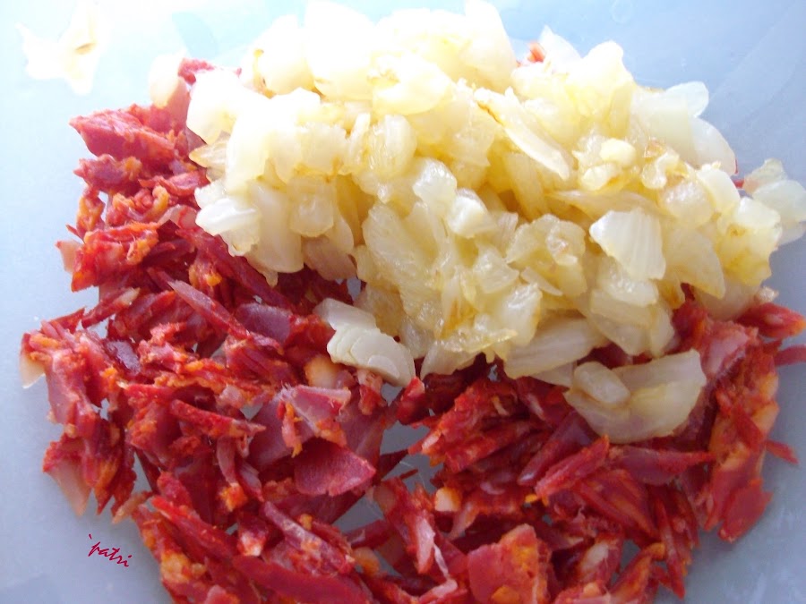 mezclar con el chorizo cortado en trocitos muy pequeños