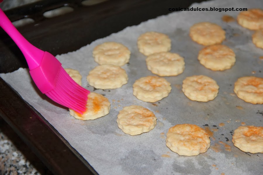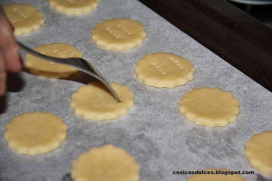 Las colocamos sobre una bandeja con papel de horno, la pinchamos con un tenedor y las horneamos unos diez minutos a 200 º con el horno precalentado. El tiempo como siempre dependerá de cada horno. Lo ideal es sacarlas cuando empiezan a oscurecerse los filitos (cuidado que no se queme, pues es una galleta que después de horneada sigue siendo muy blanca).