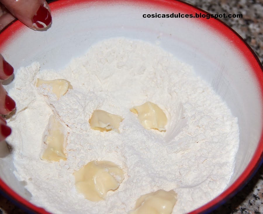En un bol colocamos la harina, mezclada con la sal, la levadura y el azúcar. Añadimos sobre ella la mantequilla cortada en trocitos y vamos pellizcando con la yema de los dedos hasta que nos quede una masa arenosa.