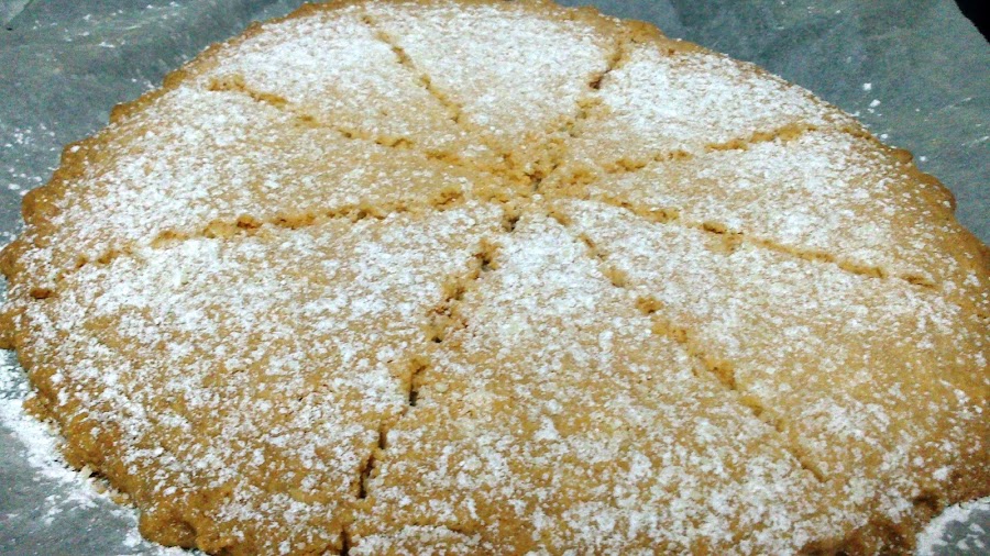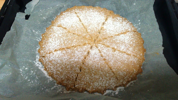 Ponemos el horno a 160º si es de ventilador. Metemos la bandeja y dejamos hornear durante 25 minutos hasta que esté un poquito dorada y hecha por dentro. Sacamos del horno y dejamos que enfríe por completo en la bandeja. Para decorarla podemos poner una blonda de papel y echar por encima azúcar glass, retirando la blonda con cuidado para que quede el dibujo de ésta perfectamente estampado en la galleta. Yo no tenía blonda así que eché el azúcar glass por encima tal cual.
