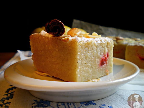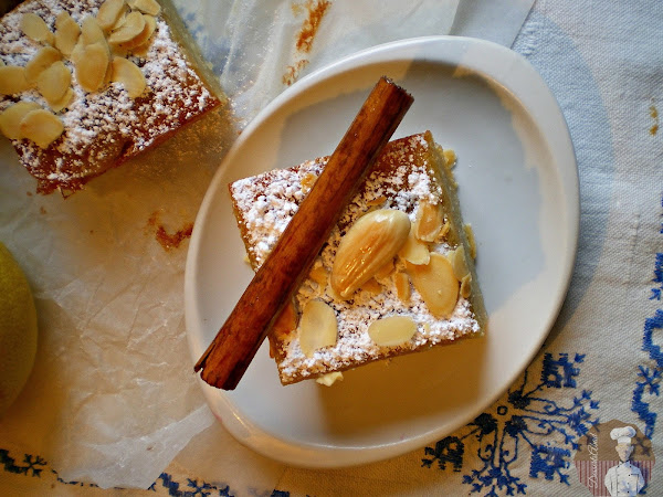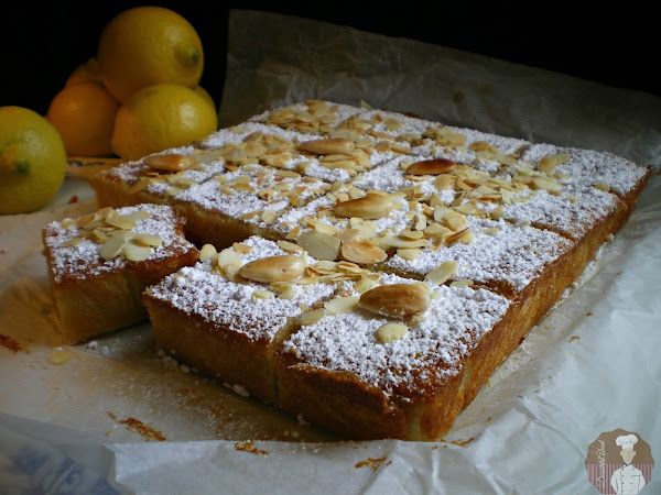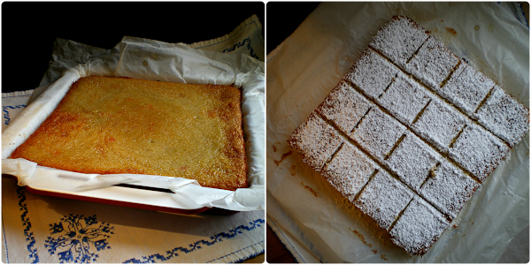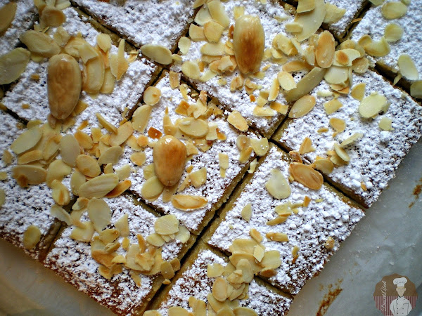 Sacar del horno, desmoldar y dejar enfriar completamente. Cortar en porciones de 6x6 centímetros, espolvoreando con azúcar glas y almendras laminadas.