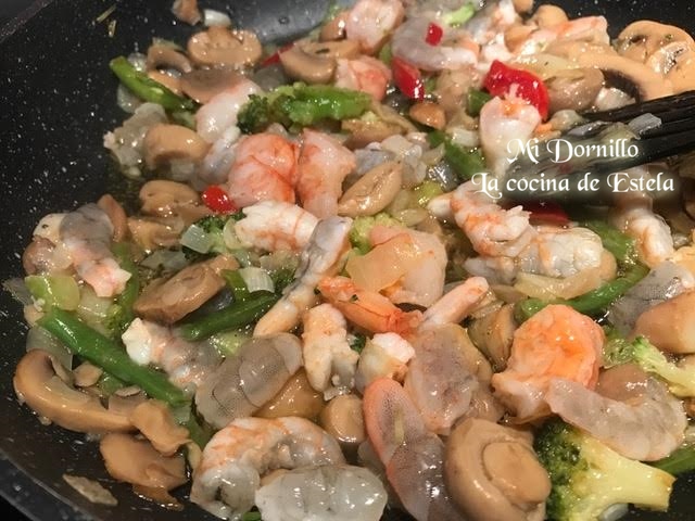 Añadimos los champiñones cortados en laminas bien limpios y dejamos unos 5 minutos. (*Yo les puse un poco mas de verdura...brocoli, y ajetes tiernos*)