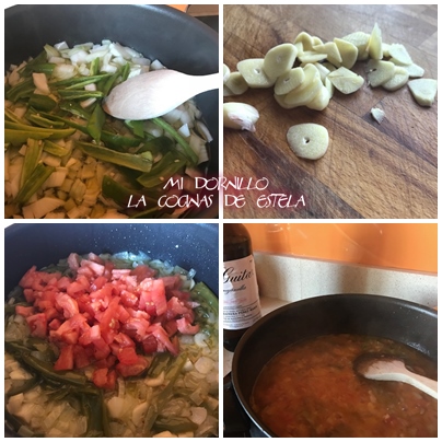 Cuando ablande ponemos los ajos en láminas finas. Mientras pelamos los tomates y cortamos en trocitos. Añadimos también con el resto de verdura.