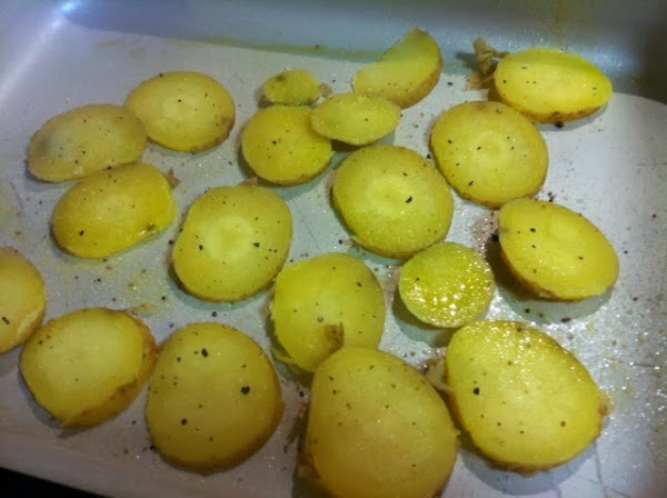 En una bandeja de horno echáis una pizca de aceite para que no se peguen las patatas y las ponéis en el fondo cortadas en rodajas de un cm aproximadamente. Con piel o si piel (a vuestro gusto).