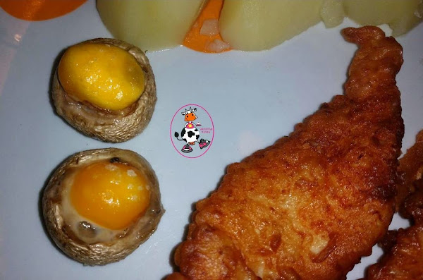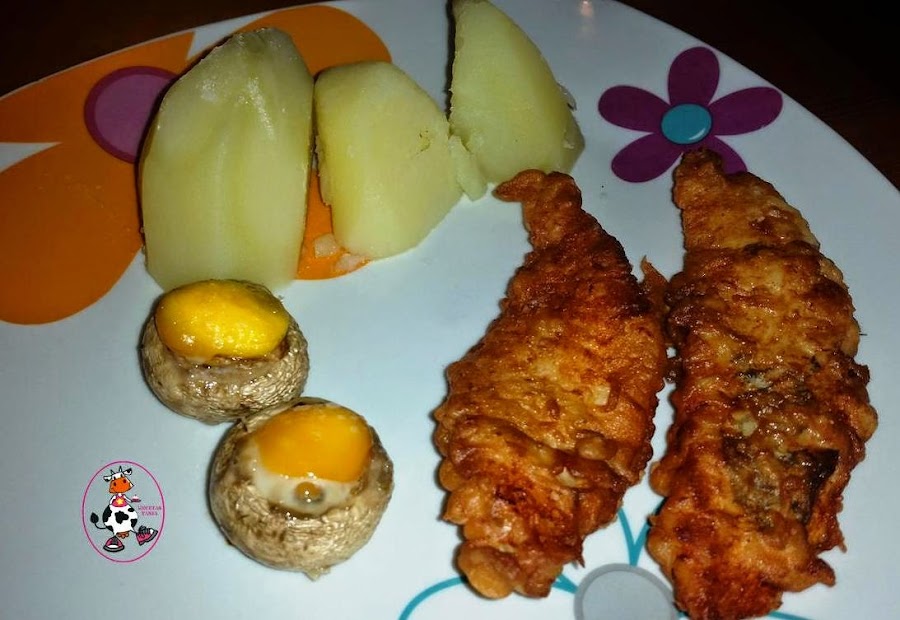 En un plato ponemos las papas, el pescado rebozado y los champiñones rellenos de huevo de codorniz. Y a comer!!!