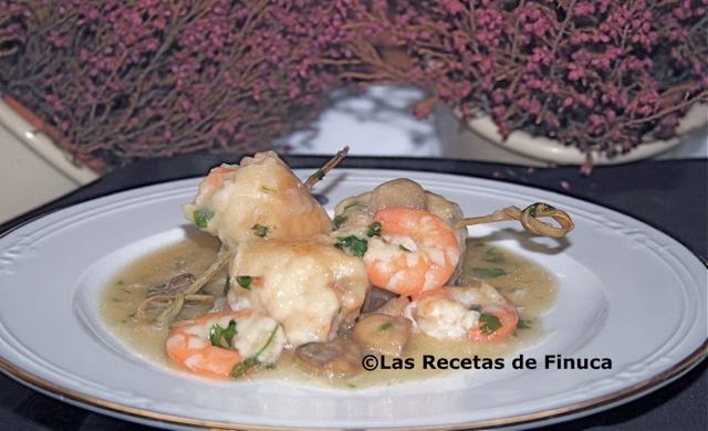 Ponemos aceite a calentar en una sartén. Salpimentamos ligeramente los filetes de gallo, colocamos una gamba sobre cada filete, enrollamos y sujetamos con una brocheta. Los pasamos por harina y freímos. Es importante que el aceite esté bien caliente. Vamos a sellarlos, vuelta y vuelta en la sartén. Quedarán dorados por fuera pero sin hacerse demasiado por dentro. Terminarán de cocinarse en la salsa preparada. Dejamos sobre papel de cocina según los hacemos para que suelten el exceso de aceite y una vez hechos todos los colocamos sobre la salsa junto con las gambas que no hemos utilizado para su relleno. Dejamos que se hagan 10 minutos y ya tenemos nuestro plato listo. Como podéis ver se pueden servir con o sin la brocheta.