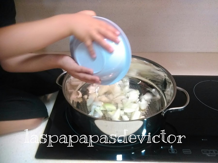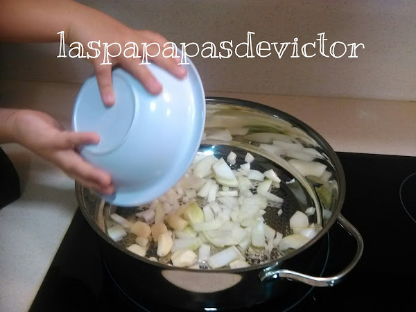 En una olla grande poner el aceite, a la que esté caliente incorporar los ajos pelados pero enteros, la cebolla cortada en juliana