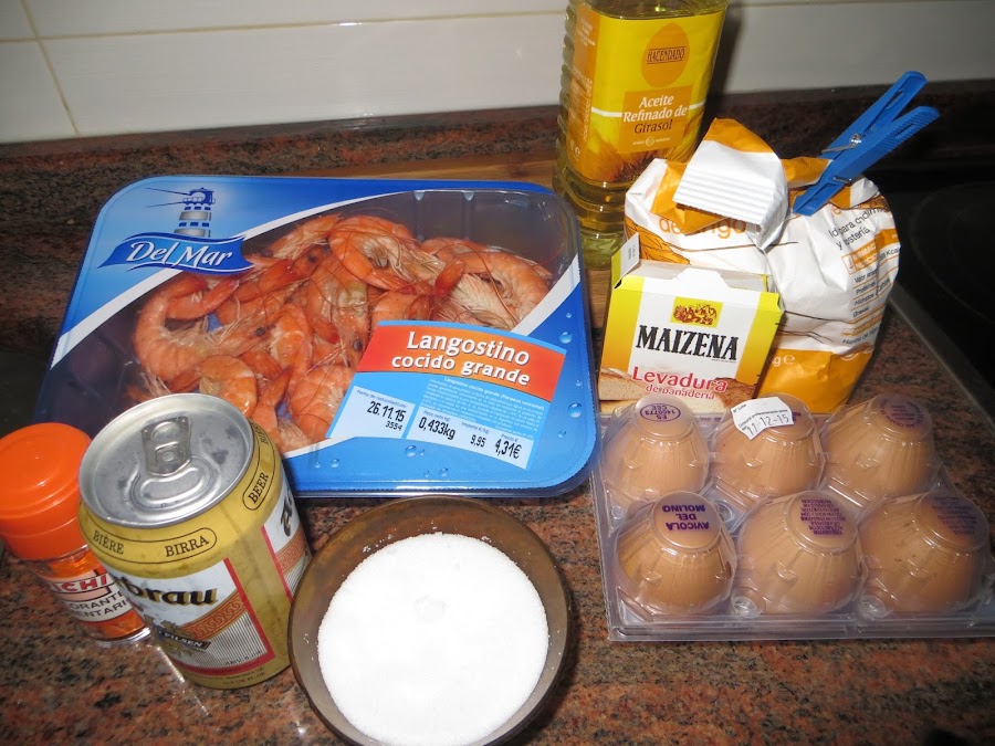 El siguiente paso es realizar la mezcla donde vamos a mojar las gambas, se echan todos los ingredientes, excepto el aceite, es decir, la harina, el huevo, la sal, la cerveza y el colorante y le damos varias vueltas, si queda demasiado líquida añadirle un poco más de harina, si por el contrario queda demasiado sólida, un poco más de cerveza.