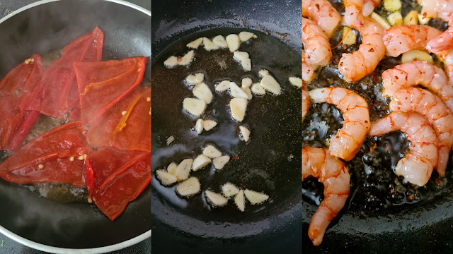 INGREDIENTES: Pimientos del piquillo en conserva, gambas de nuestro gusto, hoy lo hemos hecho con gamba roja de mediano calibre, ajos a gusto, sal y aceite de oliva Aove.