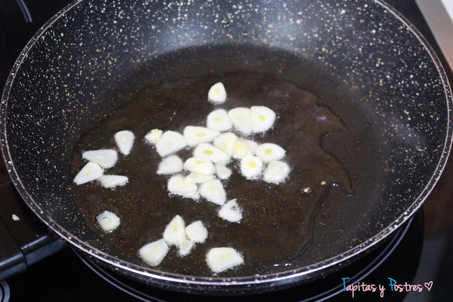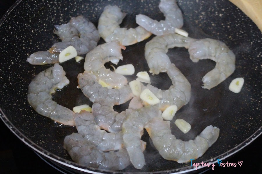 Vamos a poner los ajos picados con los cuerpos de las gambas y salteamos.