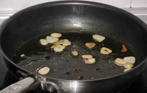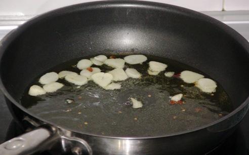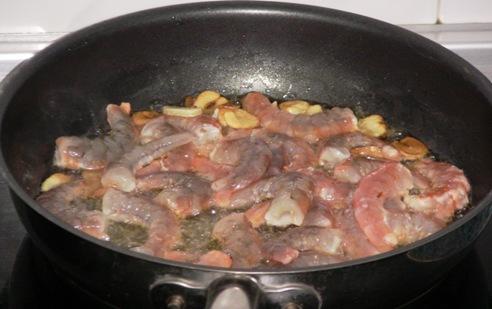 Como lo vamos a tomar como tapa con 150 gr. por persona es mas que suficiente, 2 dientes de ajo hermosos y 2 guindillas cayena.En primer lugar pelamos y cortamos los ajos en láminas finas, lo ponemos en una sartén con aceite de oliva y añadimos las dos guindillas cortadas en un par de trozos cada una.