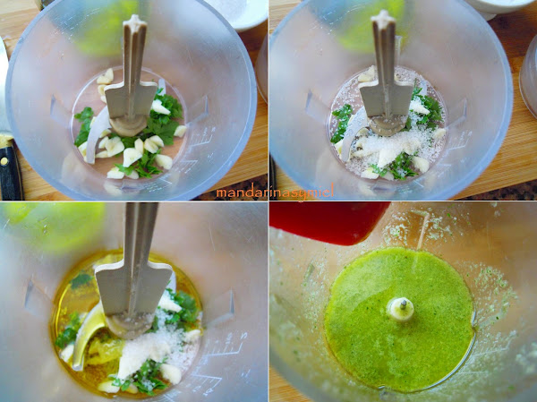Pica en un mortero o tritura en una picadora los dientes de ajo, el perejil y un poquito de sal hasta que tengas una pasta sin trozos grandes.