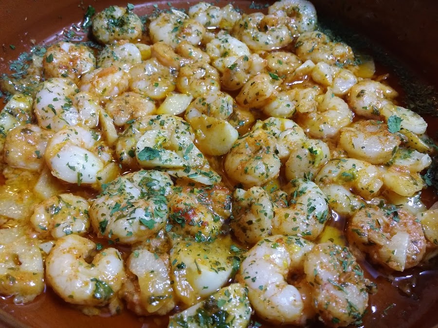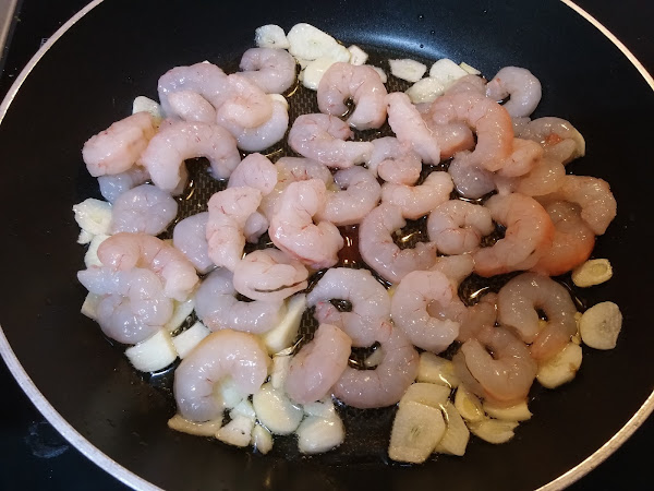 Cuando veamos que empiezan a dorarse echamos las gambas. Si son congeladas las habremos descongelado la noche antes.