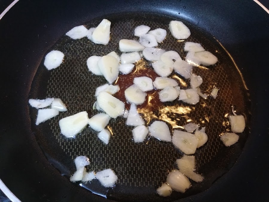 En una sartén echamos un poco de aceite y sofreímos los ajos cortados a rodajitas. Cuidado que no se quemen.