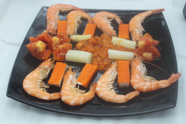 Para realizar este vistoso plato, casi no tenemos que hacer nada en la cocina, lo más complicado es descongelar las gambas y el surimi (palitos de cangrejo).