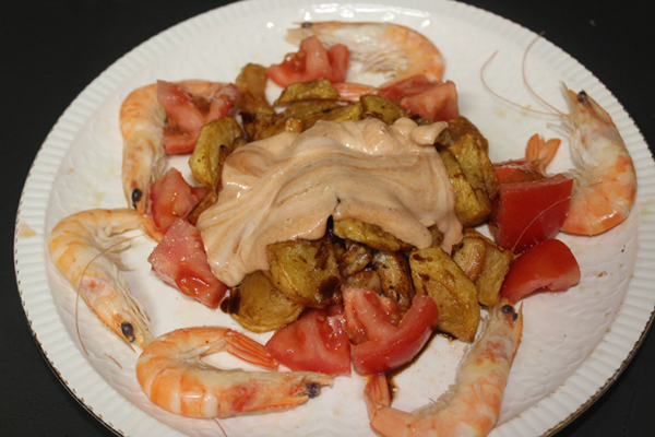 Mezclamos al gusto mayonesa, kétchup y salsa de soja, cubriendo las patatas con esta salsa.