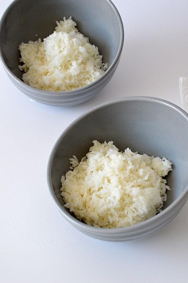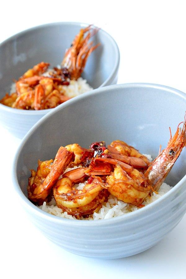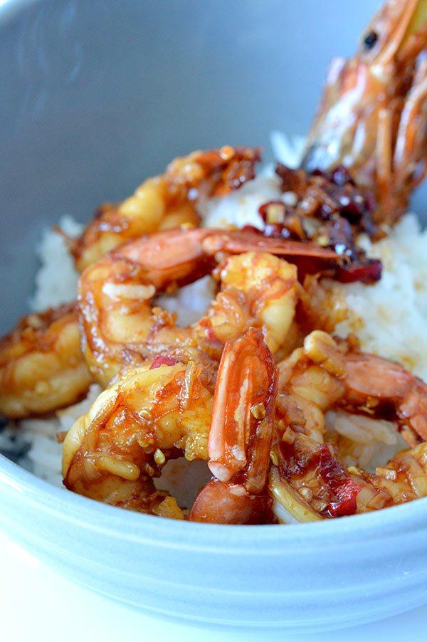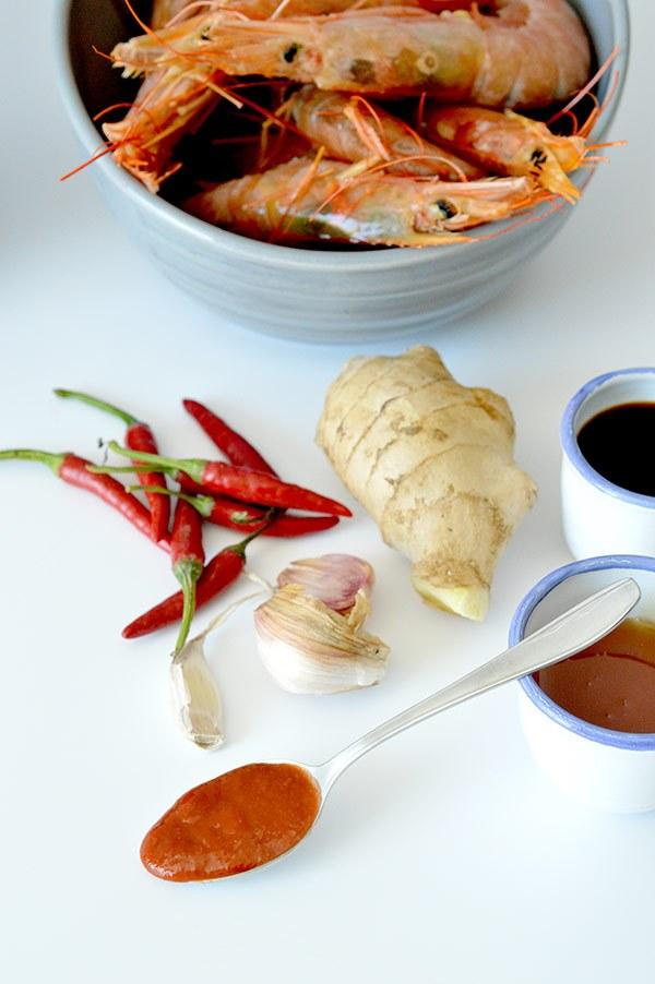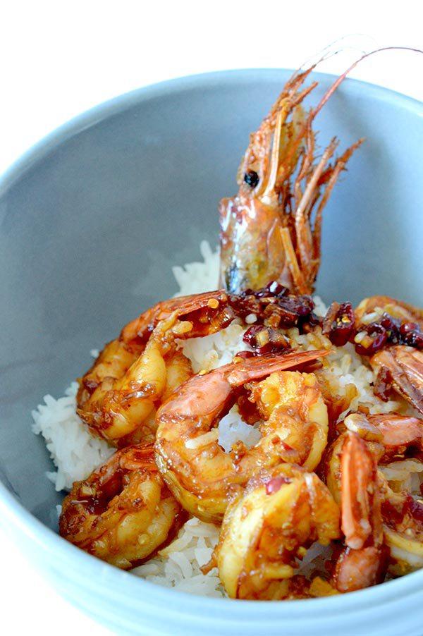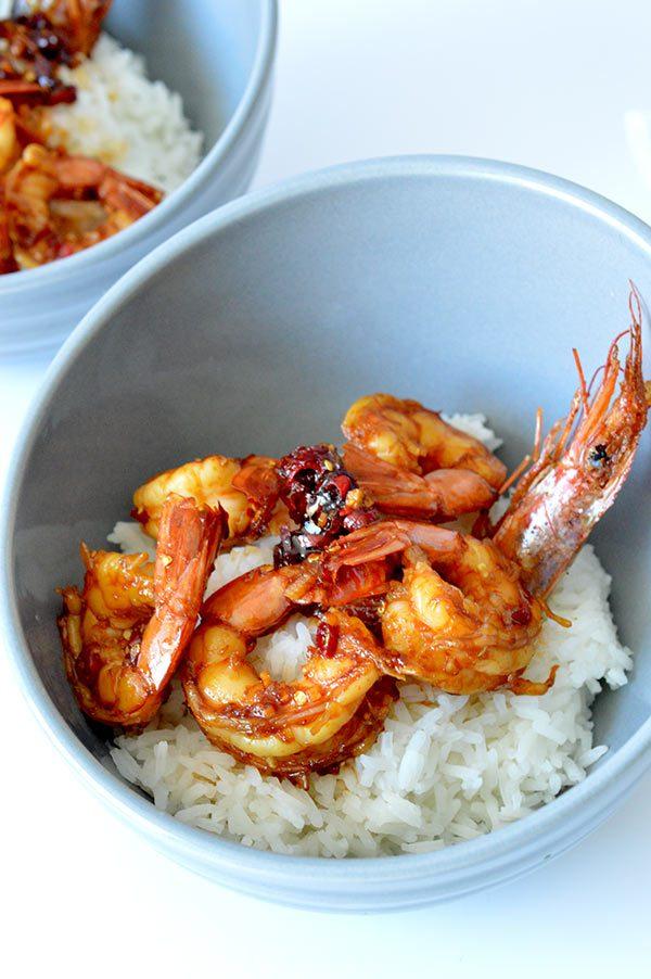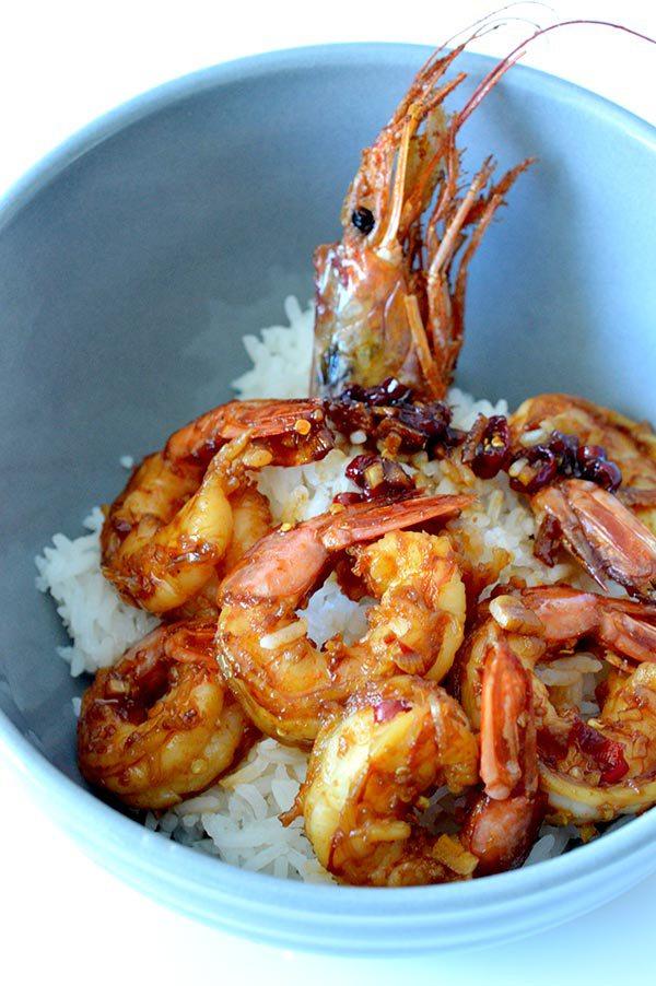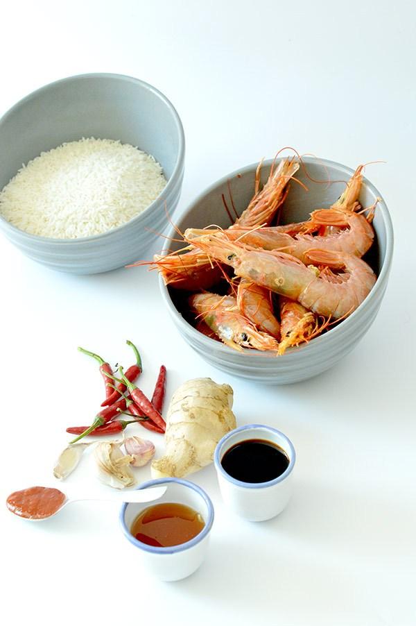He acompañado este plato con arroz Jazmín, que es también muy fácil de encontrar y tiene mucho aroma, ademas se cuece rapidísimo, yo he cocido mas cantidad y así ya tengo para las guarniciones de otros platos o para hacer un arroz otro día! también he frito unas cabezas de gamba mucho par que estén bien crujientes y después usar un pelin de ese aceite para darle un toque al plato, esto es completamente opcional…