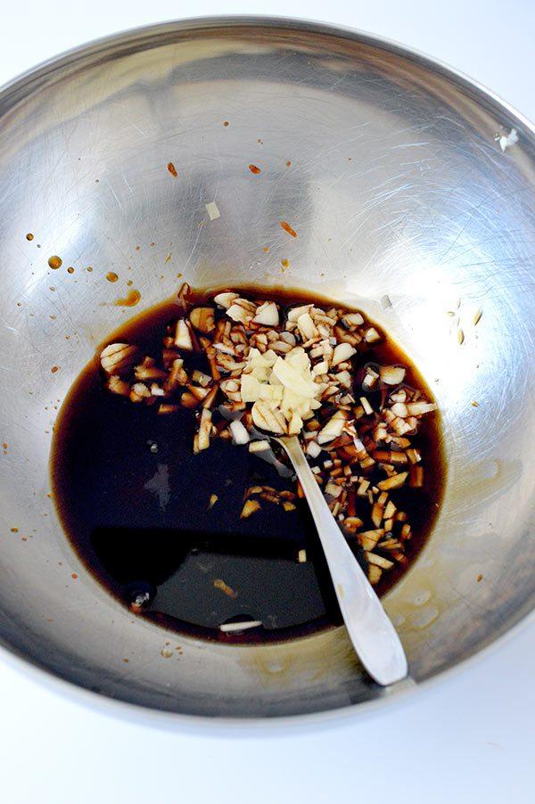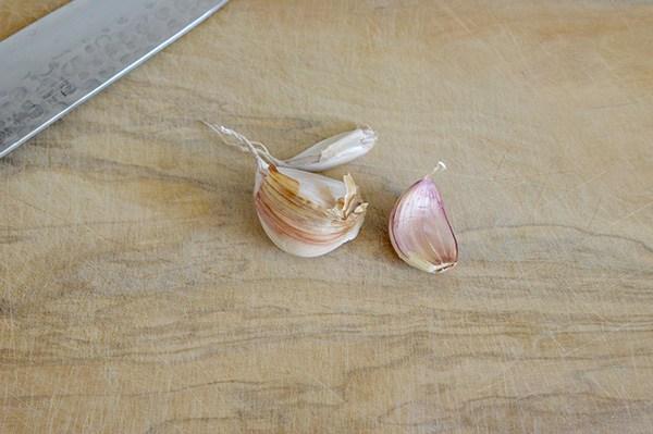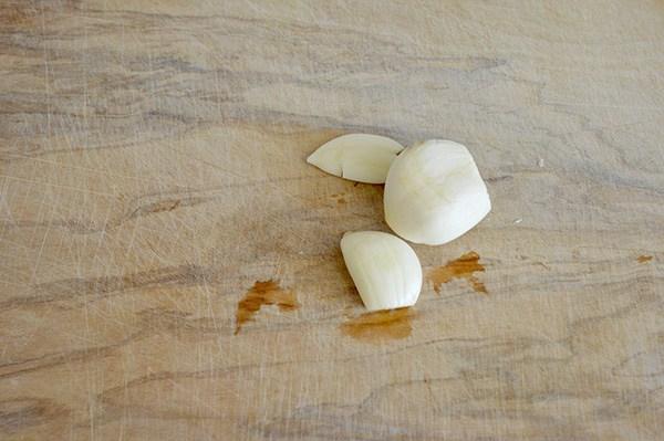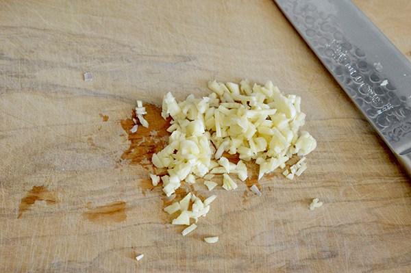 Pelamos lo ajos y los picamos finamente. Lo añadimos al bol.