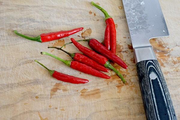 Pocas veces encuentro guindillas frescas, así que cuando las veo en el super no me puedo resistir, estas la verdad es que no pican casi nada, han sido un poco decepción porque a mi me gustan picantes, por eso he echado tantas, de todas maneras creo que el toque picante se lo ha dado la siracha… de todas maneras si no encontráis guindillas frescas usar secas pero en menor cantidad, y de todas maneras probarlas antes, ya que depende mucho el tipo de guindilla el picor!!