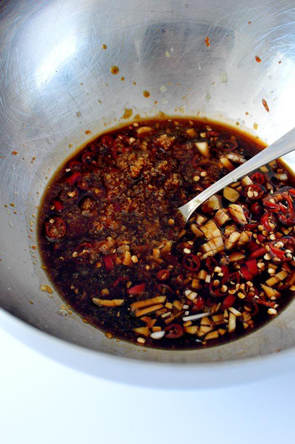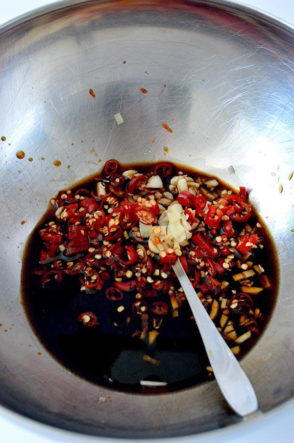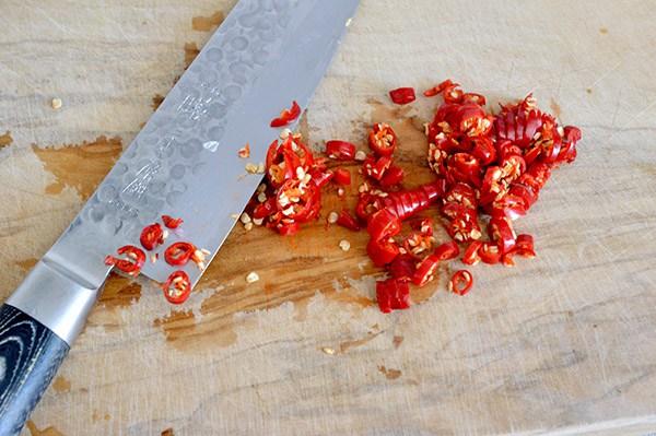 Limpiamos las guindillas y las picamos y lo añadimos a la marinada.