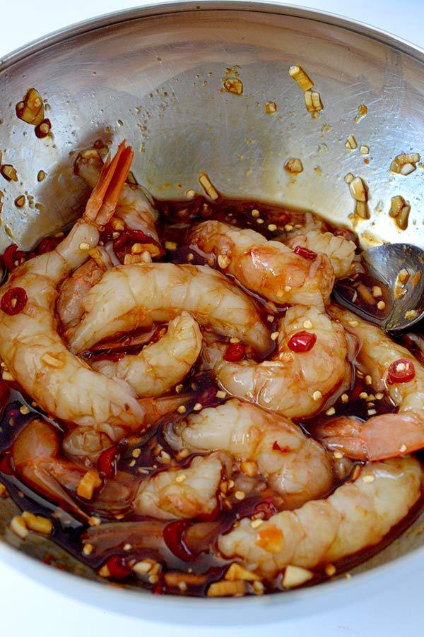 Lo mezclamos todo bien y añadimos las gambas, las reservamos en la nevera al menos 20 minutos.