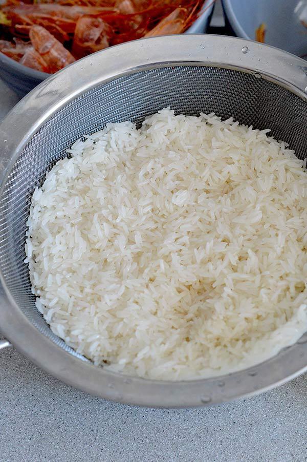 Mientras tanto vamos cociendo el arroz, es mejor lavarlo un poco antes de cocerlo para eliminar el almidón. Cocemos durante 10 minutos en abundante agua hirviendo.