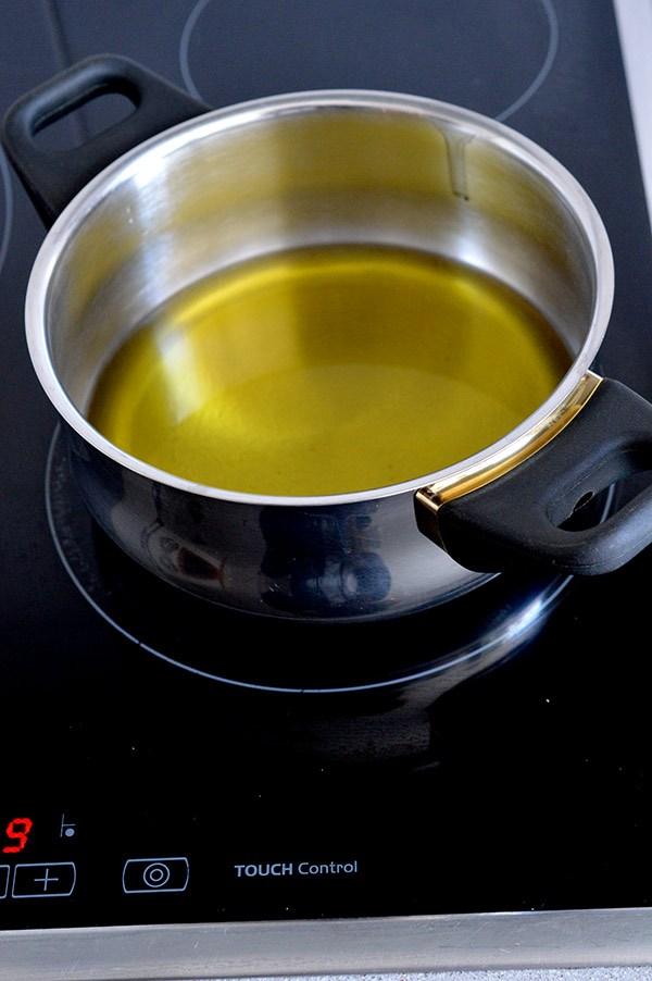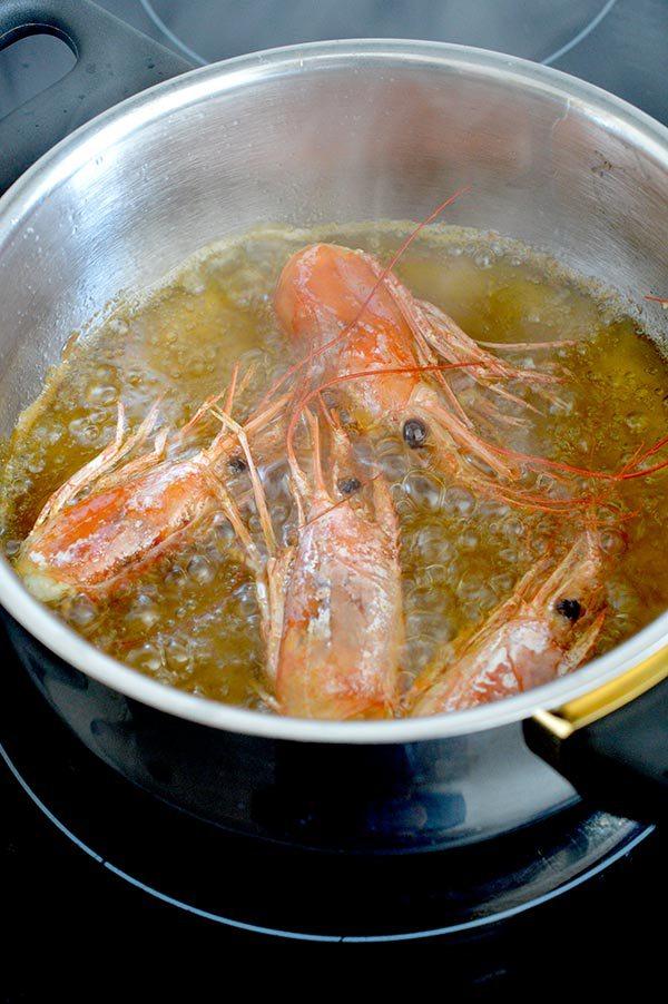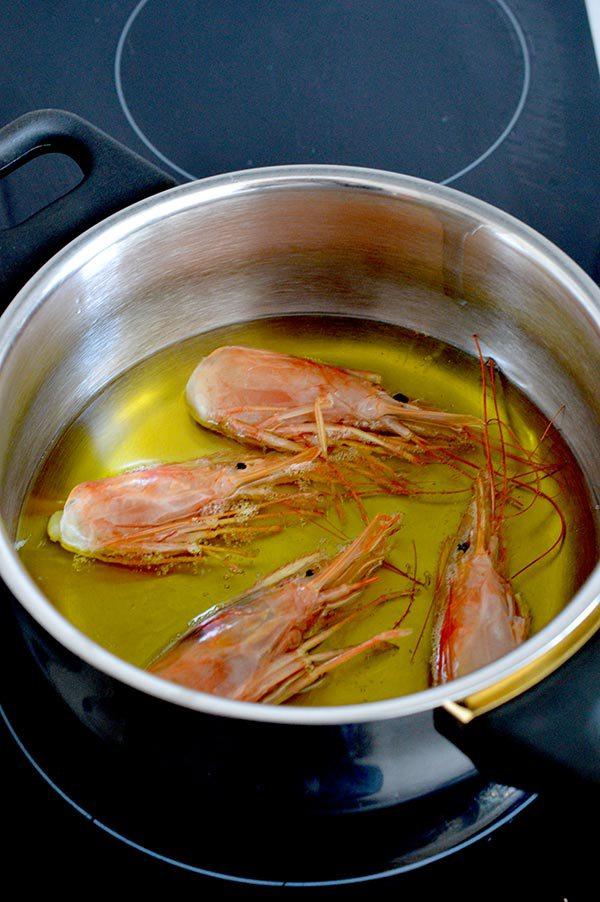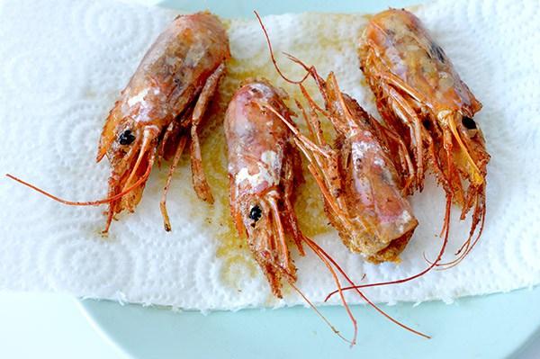 Freímos las cabezas de gamba en abundante aceite, hasta que estén muy doraditas.