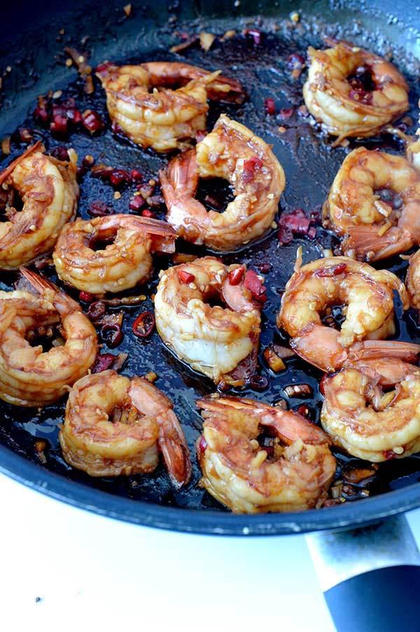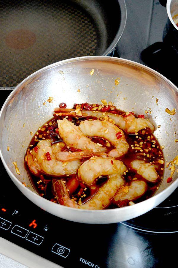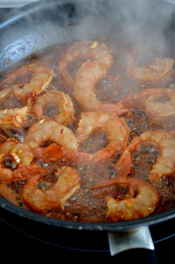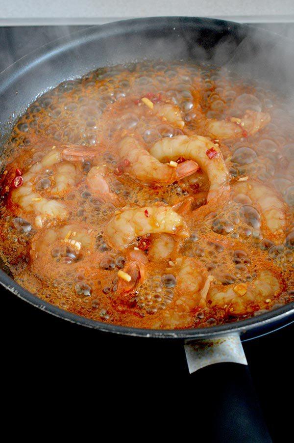 Calentamos una sarten y añadimos las gambas una vez este caliente junto con la marinada.
