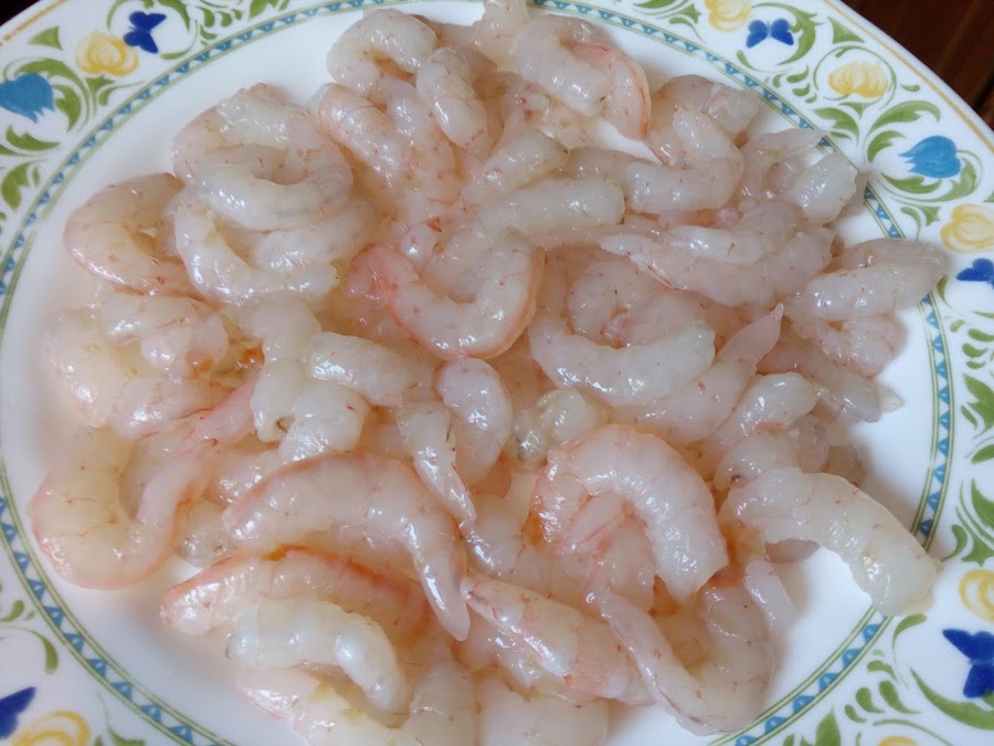 Pelar las gambas y reservar la carne (las cabezas y la piel las suelo usar para hacer un caldo que suelo congelar y usar para cualquier receta que necesite darle más sabor a marisco).