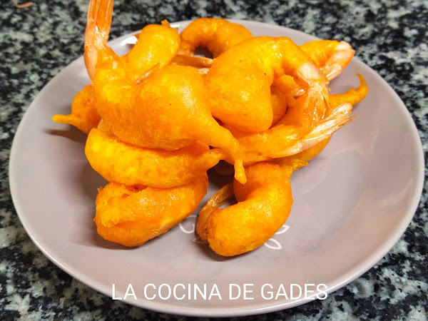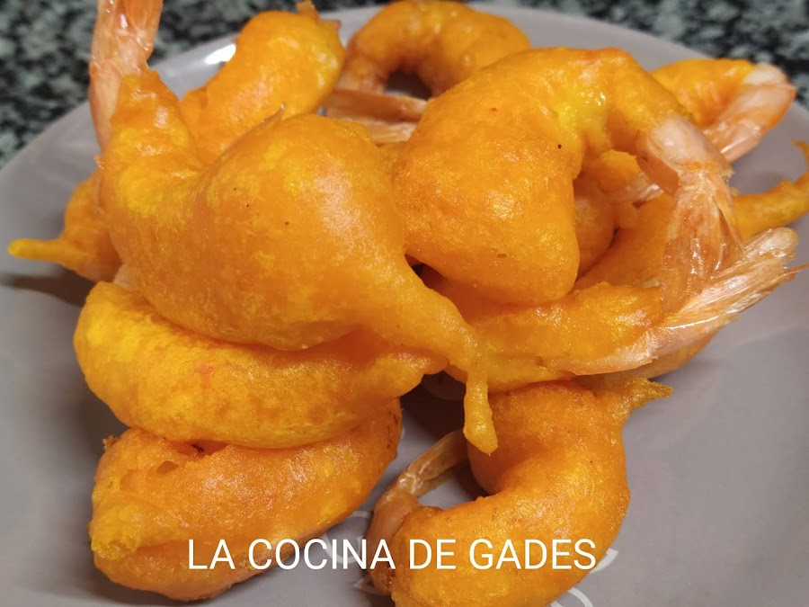 Los gambas los bañamos en la masa, pero la cola la dejamos limpia de masa.