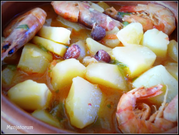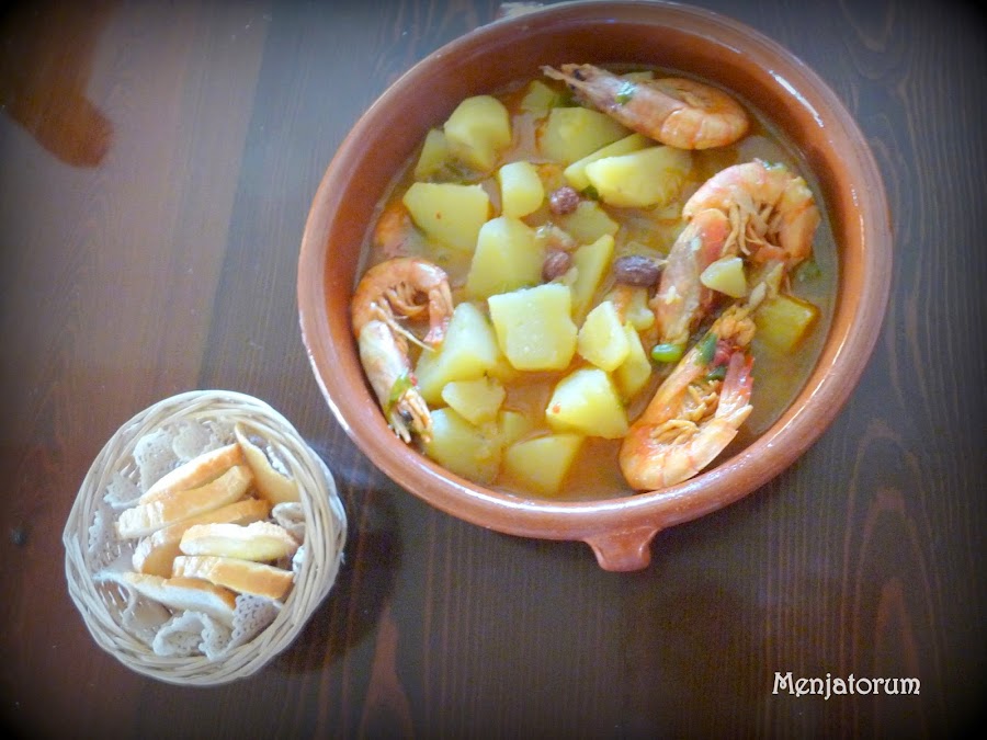 traducido literalmente,es un guiso de patatas con un sofrito hecho previamente,al que podemos añadir trozos de pescado,panadera de pescado o trozos de carne, panadera de carne.