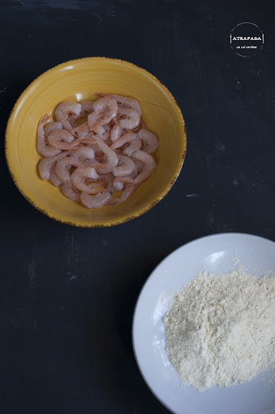 Lavamos y quitamos la cabeza de todas las gambas, dejando solo la piel. Sazonamos. Pasamos por harina especial para freír y quitamos el exceso de ella con un cedazo o un colador.