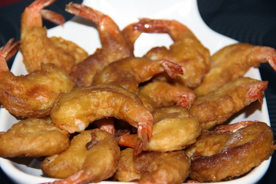 Calentamos aceite en una sartén y vamos pasando las gambas por el rebozado y friendolas no mucho para que el rebozado quede crujiente y la gamba no muy seca.